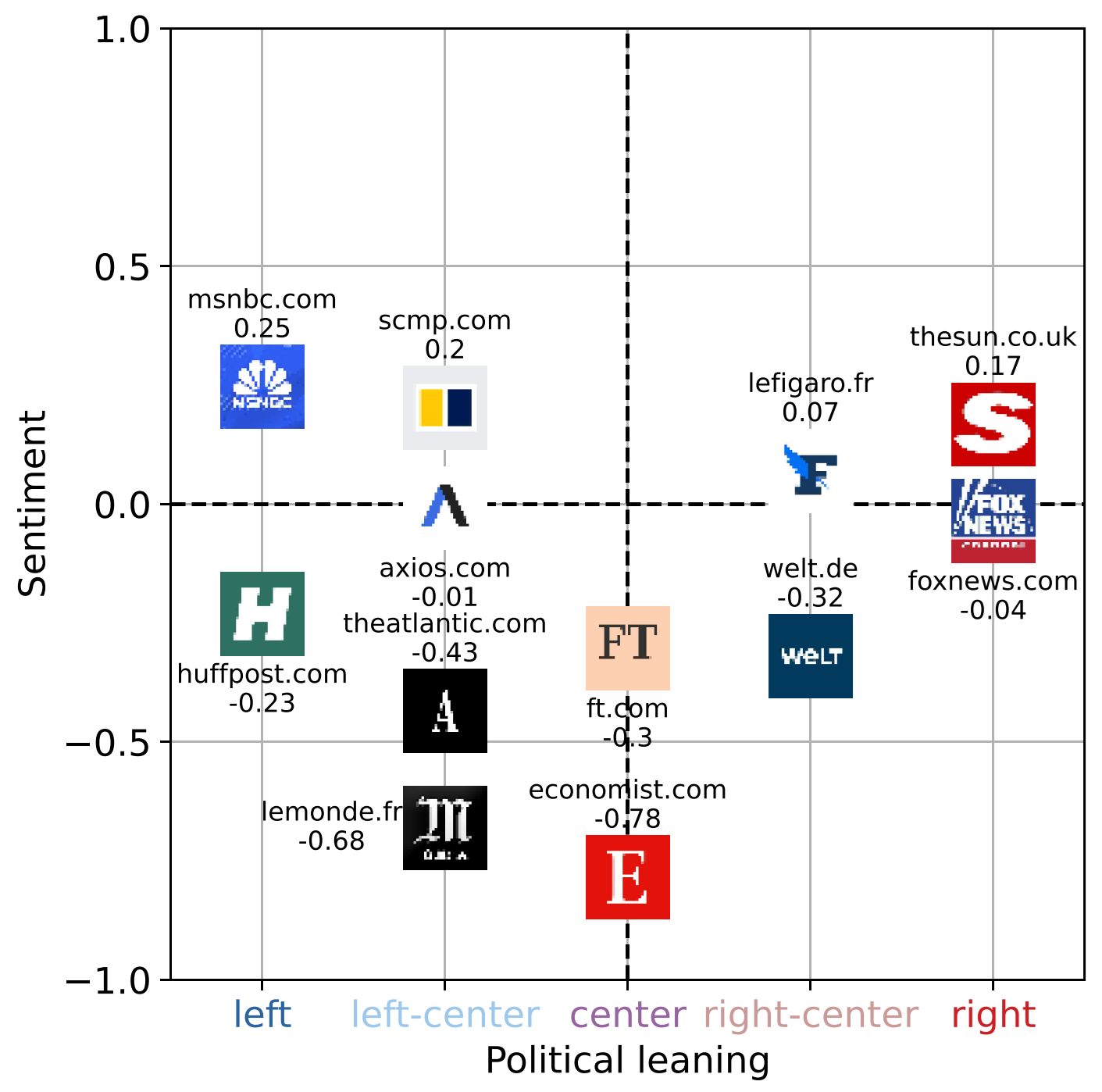 The figure shows the average compound sentiment scores for tweets sharing URLs from a qualitative selection of news outlets with different political leaning according Media Bias/Fact Check.